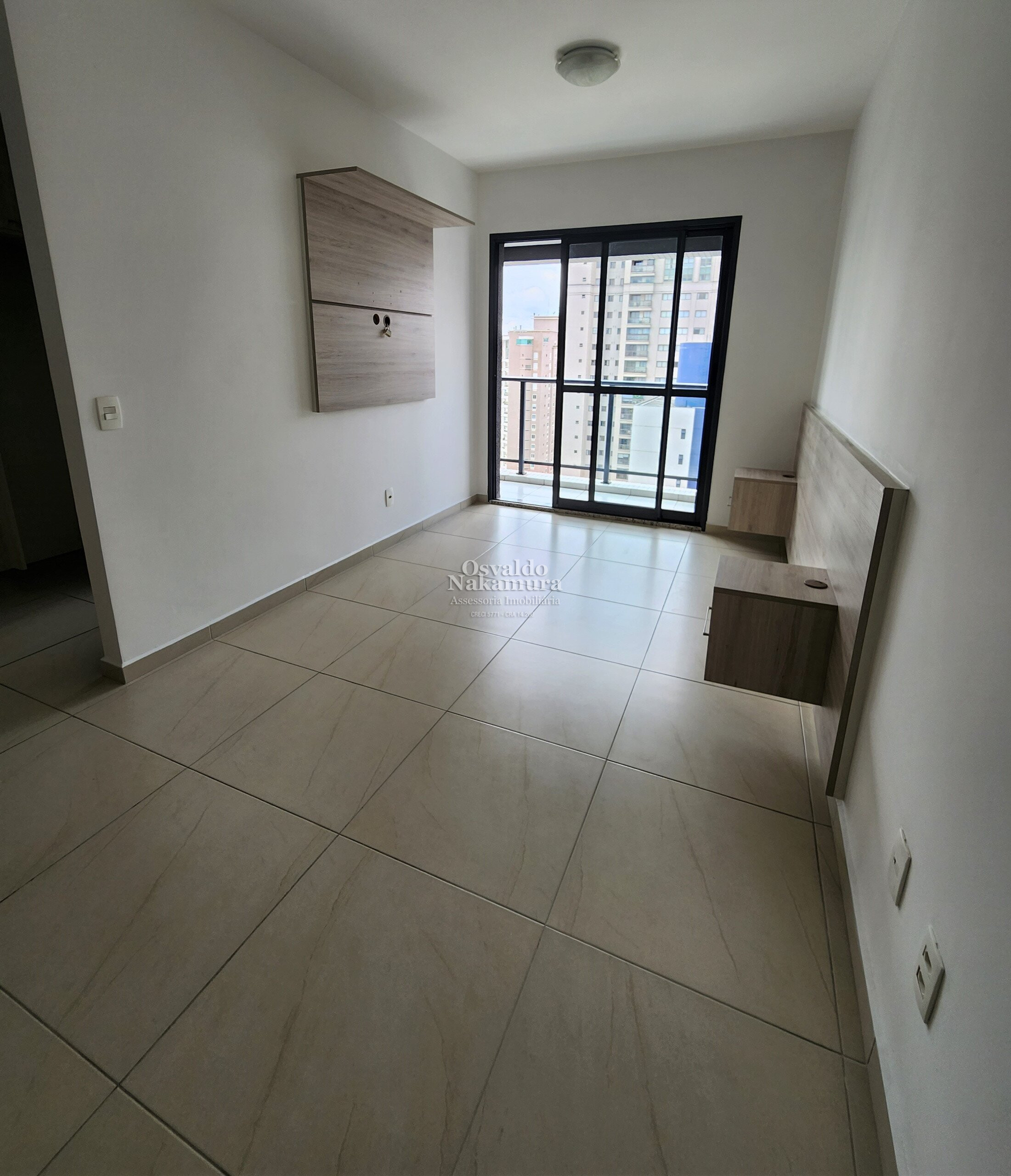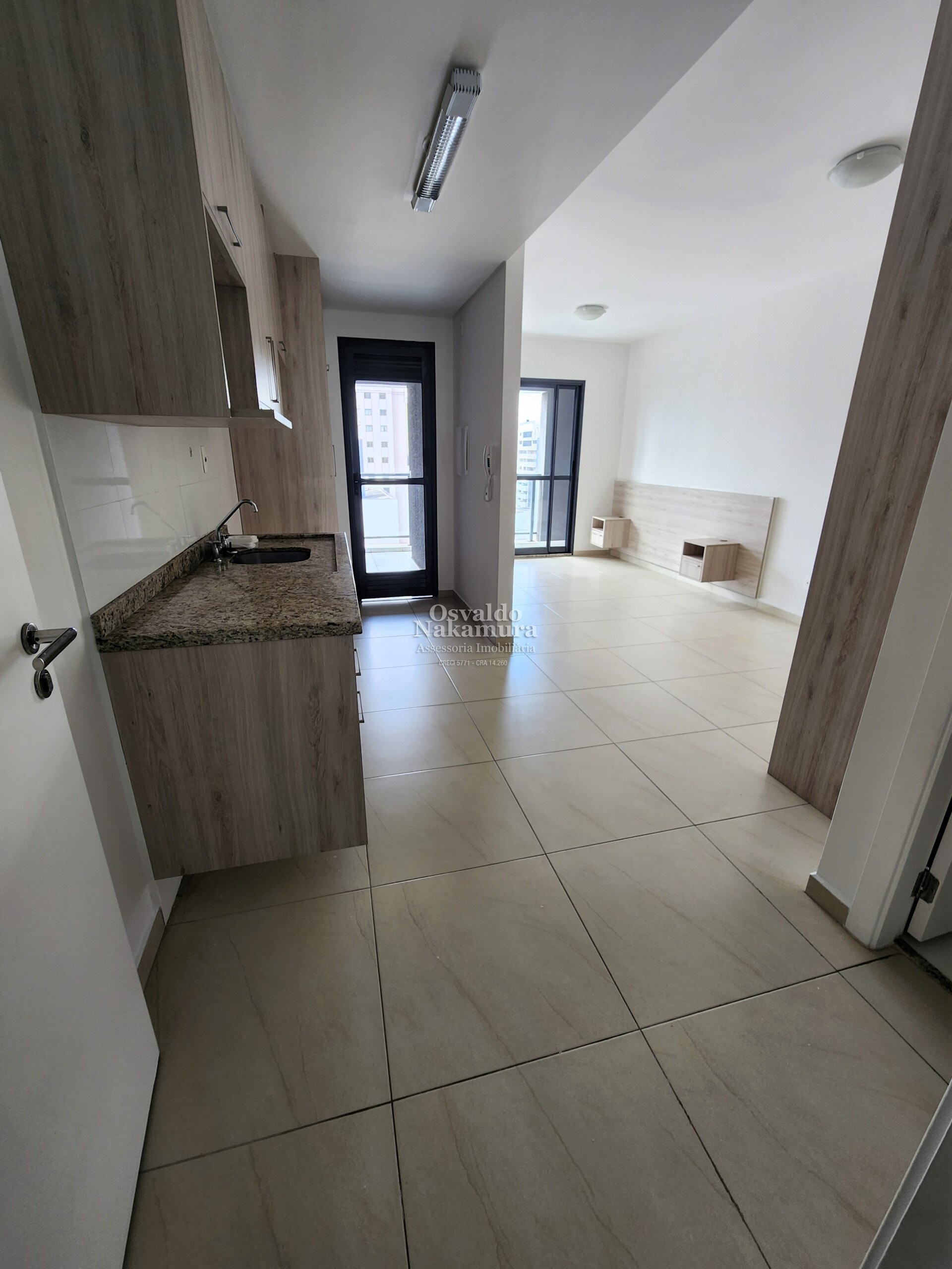 Sala e dormitório, cozinha, banheiro, lavanderia e sacada com churrasqueira.